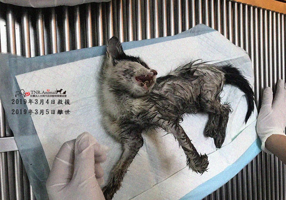 這孩子叫做小賓,當時身上黏著不知道什麼樣的液體,原以為是黏鼠板,但送去醫院後,醫生判斷應該不是,我們就算再努力的幫小賓清理,可是小賓的身上總是還有沒有辦法順利清掉的部分。